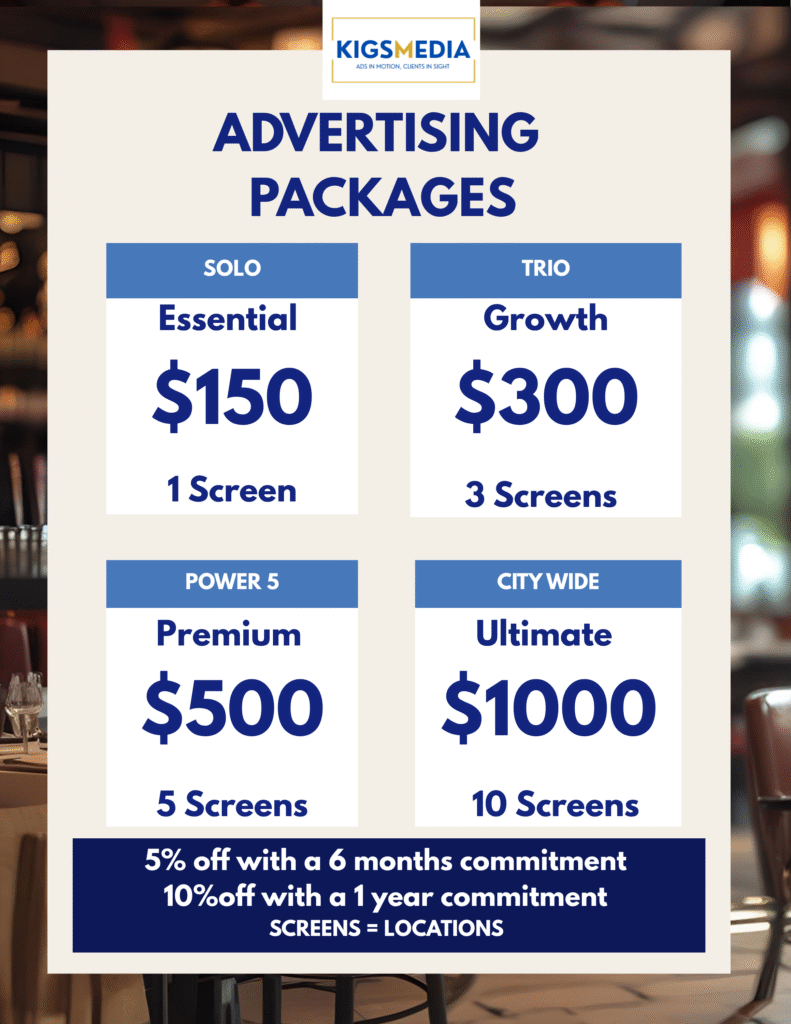 KIGS Media offers simple, flexible ad packages for real visibility in local spaces. Whether you’re reaching one neighbourhood or multiple communities, we’ve got a plan for you.