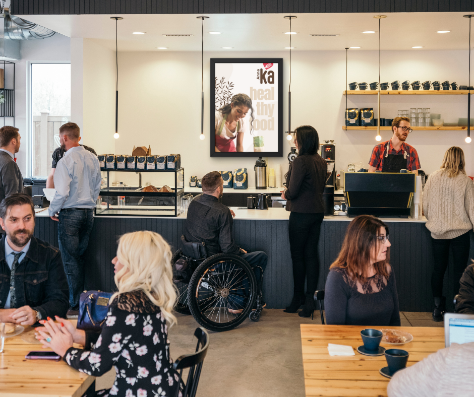 Your 15-second ad plays on sleek wall-mounted screens in places where people are already paying attention while waiting for food, sipping coffee, or getting their hair done. It’s targeted, non-intrusive, and high-impact.